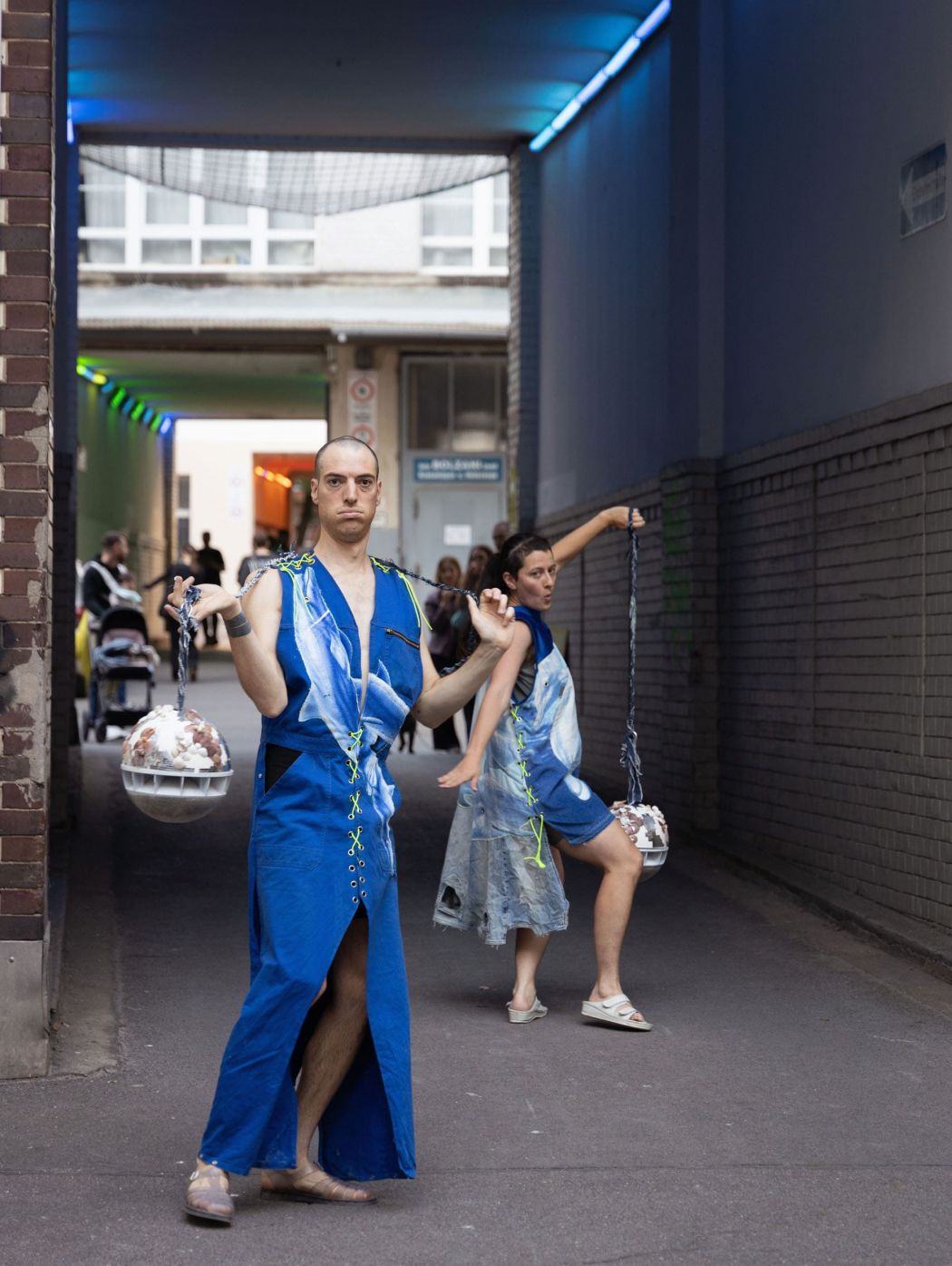 Nous utiliserons la méthodologie de SCI Fi ANATOMY - pratique de storytelling somatique développée par Léa - et la MER DE JEANS - dispositif de sculptures textiles en denim qui passent de scénographies à costumes à sujets performatifs, extensions cyborg queue de cétacé qui altèrent les corps, queerisent le rapport sujet/objet et nous transforment en un clan de baleines d’eau douce.